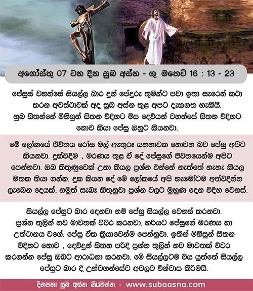 13 ජේසුස් වහන්සේ පිලිප්පි කායිසාරියේ පෙදෙස්වලට පැමිණි කල, ”මනුෂ්ය-පුත්රයාණෝ කවරෙක් ය කියා මිනිස්සු කියත් දැ”යි සිය ශ්රාවකයන්ගෙන් ඇසූ සේක. 14 ඔව්හු කතා කොට, ”සමහරෙක්, ‘ස්නාවක ජොහන් ය’ කියා ද සමහරෙක්, ‘එලියා ය’ කියා ද, අන් සමහරෙක් ‘ජෙරෙමියා නොහොත් දිවැසිවරයන්ගෙන් කෙනෙක් ය’ කියා ද කියති”යි කී හ. 15 ”එහෙත් ඔබ මා කවරෙකු කියා කියන්නහු දැ”යි උන් වහන්සේ ඔවුන්ගෙන් ඇසූ සේක. 16 සීමොන් පේදුරු උත්තර දෙමින්, ”ඔබ ක්රිස්තුවරයාණෝ ය, ජීවමාන දෙවියන් වහන්සේගේ පුත්රයාණෝ ය”යි කී ය. 17 ජේසුස් වහන්සේ උත්තර දෙමින්, ”ජෝනාගේ පුත් සීමොන්, ඔබ ඉතා භාග්යවන්ත ය. මන්ද, ස්වර්ගයෙහි වැඩවසන මාගේ පියාණන් වහන්සේ විසින් මිස මනුෂ්ය මඟකින් මෙය ඔබට එළිදරව් නොකරන ලද්දේ ය. 18 මම ඔබට කියමි: ඔබ පේදුරු ය. මේ පර්වතය පිට මාගේ සභාව ගොඩනඟන්නෙමි. පාතාලයේ දොරටුවලට වුව ද, එය පරාජය නොකළ හැකි ය. 19 ස්වර්ග රාජ්යයේ යතුරු ඔබට දෙන්නෙමි. ඔබ පොළොවෙහි දී යමක් බඳින්නෙහි ද, එය ස්වර්ගයෙහි දී බඳිනු ලබන්නේ ය. ඔබ පොළොවෙහි දී යමක් මුදන්නෙහි ද එය ස්වර්ගයෙහි දී මුදනු ලබන්නේ ය”යි වදාළ සේක. 20 තවද, තමන් ක්රිස්තුන් වහන්සේ බව කිසිවෙකුට නොකියන ලෙස උන් වහන්සේ ශ්රාවකයන්ට අණ දුන් සේක. 21 එවක් පටන් ජේසුස් වහන්සේ, තමන් ජෙරුසලමට වැඩම කර, ප්රජා මූලිකයන්ගෙන් හා නායක පූජකයන්ගෙන් ද විනයධරයන්ගෙන් ද බොහෝ දුක් වේදනා විඳින්ටත් මරනු ලබන්ටත්, තුන් වන දා උත්ථාන කරනු ලබන්ටත් යන බව සිය ශ්රාවකයන්ට දන්වන්න පටන්ගත් සේක. 22 එවිට පේදුරු උන් වහන්සේ පැත්තකට කැඳවා තරවටු කරන්න පටන් ගෙන, ”ස්වාමීනි, එය දුරින් ම දුරුවේ වා! එවැන්නක් ඔබට කවදාවත් සිදු නො වේ වා”යි කී ය. 23 එහෙත්, උන් වහන්සේ හැරී, පේදුරුට කතා කොට, ”සාතන්, අහකට යව; නුඹ මට බාධාවකි; නුඹ සිතන්නේ මිනිසුන් සිතන විධියට මිස දෙවියන් වහන්සේ සිතන විධියට නොවේ ය”යි වදාළ සේක.