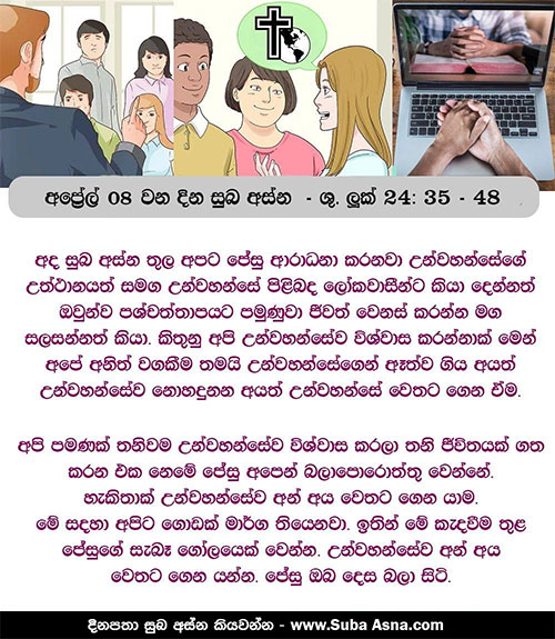 13 එම දවසෙහි ශ්රාවකයන්ගෙන් දෙදෙනෙක් ජෙරුසලමේ සිට කිලෝමීටර් එකොළහක් පමණ දුර වූ එම්මාවුස් නම් ගමට යමින් සිටියහ. 14 එසේ යද්දී, ඔව්හු සිදුවූ සියල්ල ගැන කතා කරමින් ගියහ. 15 තවද, ඔවුන් සාකච්ඡා කරමින් යද්දී, ජේසුස් වහන්සේ ම ඔවුන් සමීපයට වැඩ, ඔවුන් හා සමඟ ගමන්ගත් සේක. 16 ඔවුන් උන් වහන්සේ දුටු නමුත්, ඔවුන්ට උන් වහන්සේ හඳුනා ගත නොහැකි විය. 17 උන් වහන්සේ ඔවුන්ට කතා කොට, ”මේ ඔබ තර්ක කරමින් යන්නේ කුමන කාරණා ගැන දැ”යි ඇසූ සේක. ඔව්හු දුක්මුසු මුහුණින් යුක්ත ව නතර වූ හ. 18 ඔවුන්ගෙන් ක්ලේයෝපස් නම් තැනැත්තා උත්තර දෙමින්, ”මේ දවස්වල ජෙරුසලමෙහි සිදුවූ කාරණා නොදැන සිටින අමුත්තා ඔබ පමණක් දැ”යි උන් වහන්සේට කී ය. 19 ”කවර කාරණා දැ”යි උන් වහන්සේ ඔවුන්ගෙන් ඇසූ සේක. ඔව්හු උත්තර දෙමින්, ”නාසරෙත්හි ජේසුස් වහන්සේ පිළිබඳ කාරණා ය. උන් වහන්සේ දෙවියන් වහන්සේ හා සකල ජනතාව ඉදිරියෙහි ක්රියාවෙහි ද කතාවෙහි ද බලසම්පන්න දිවැසිවරයෙකු ව සිටි සේක. 20 නායක පූජකවරු ද අපගේ ප්රධානීහු ද උන් වහන්සේ මරණයට නියම කොට කුරුසියෙහි ඇණ ගැසූ හ. 21 එහෙත්, ඉශ්රායෙල් මුදාලීමට සිටි එක ම තැනැන් වහන්සේ උන් වහන්සේ ය යනු අපගේ බලාපොරොත්තුව විය. එපමණක් නොවේ. මේ දේ සිදුවී අදට තුන් දවසක් ගත වී ඇත. 22 තවද, අපේ කණ්ඩායමේ ඇතැම් ස්ත්රීහු අද හිමිදිරි උදයේ සොහොන් ගෙය ළඟට ගොස්, 23 උන් වහන්සේගේ සිරුර නොදැක අවුත්, ඔවුන්ට දර්ශනය වූ දේව දූතයන් ‘උන් වහන්සේ ජීවමාන ව සිටින සේකැ’යි පැවසූ බව කියා අප විස්මිත කළහ. 24 අප හා සමඟ සිටි අයගෙන් සමහරෙක් සොහොන් ගෙය ළඟට ගොස් ඒ ස්ත්රීන් කී ලෙස ම දුටුවෝ ය. එහෙත්, ඔව්හු උන් වහන්සේ නුදුටුවෝ ය”යි කී හ. 25 එවිට උන් වහන්සේ ඔවුන් අමතා, ”බුද්ධිහීන වූ ද දිවැසිවරයන් පැවසූ සියල්ල විශ්වාස කිරීමට මැළි වූ ද තැනැත්තෙනි, 26 ක්රිස්තුන් වහන්සේ ඒ දුක් විඳ ඉක්බිති ස්වකීය තේජශ්රීයට පැමිණිය යුතු ව තිබුණා නොවේ ද” කියා, 27 මෝසෙස් හා සියලු දිවැසිවරයන්ගෙන් පටන්ගෙන, මුළු ශුද්ධ ලියවිල්ලෙහි තමන් ගැන සඳහන් කරුණු ඔවුන්ට පහදා දුන් සේක.