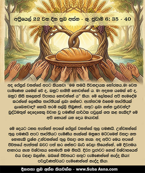 35 ජේසුස් වහන්සේ කතා කොට, ”ජීවනදායක ආහාරය මම ය, මා වෙත පැමිණෙන යමෙක් වේ ද, ඔහුට සාගිනි නොවන්නේ ය. මා අදහන යමෙක් වේ ද, ඔහුට කිසි කලෙකත් පිපාසය නොවන්නේ ය. 36 එහෙත් මා කී ලෙස ම, ඔබ මා දුටු නමුත් මා නොඅදහන්නහු ය. 37 පියාණන් වහන්සේ මට දෙන සියල්ලෝ ම මා වෙතට පැමිණෙති; මා වෙතට පැමිණෙන්නා මම කිසි සේත් ඉවත නොදමමි. 38 මා ස්වර්ගයෙන් පහළ වූයේ මාගේ ම කැමැත්ත කරන පිණිස නොව, මා එවා වදාළ තැනැන් වහන්සේගේ කැමැත්ත කරන පිණිස ය. 39 මා එවා වදාළ උන් වහන්සේගේ කැමැත්ත නම්, උන් වහන්සේ මට දුන් සියල්ලන්ගෙන් එක් කෙනෙකු වත් නැති වන්නට නෑර, සියල්ලන් ම අන්තිම දවසේ දී මා විසින් උත්ථාන කරනු ලැබීම ය. 40 පුත්රයාණන් වහන්සේ දැක උන් වහන්සේ අදහාගන්නා හැම කෙනෙකු ම සදාතන ජීවනය ලැබීම මාගේ පියාණන් වහන්සේගේ කැමැත්ත ය. මම ද අන්තිම දවසේ දී ඔවුන් උත්ථාන කරන්නෙමි”යි වදාළ සේක.