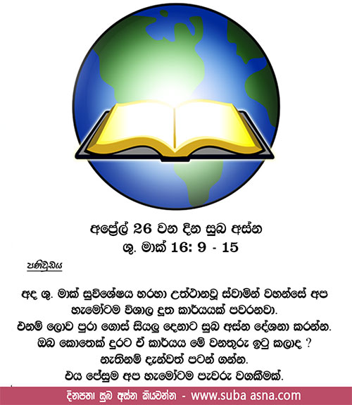 9 සතියේ පළමු වන දා අලුයම ජේසුස් වහන්සේ නැඟිට වදාළ කල, උන් වහන්සේ තමන් විසින් දුෂ්ටාත්මයන් සත් දෙනෙකු දුරු කරනු ලැබූ මග්දලායේ මරියාට මුලින් ම දර්ශනය වූ සේක. 10 ඈ ගොස්, අඬමින් වැලපෙමින් සිටි උන් වහන්සේගේ හිතවතුන්ට එපවත් සැළ කළා ය. 11 එහෙත්, උන් වහන්සේ ජීවමාන ව සිටින බව ද ඇයට දර්ශනය වූ බව ද ඇසූ විට ඔව්හු එය විශ්වාස නො කළහ.12 ඉක්බිති ඔවුන්ගෙන් දෙදෙනෙකු පිටිසරට යන කල උන් වහන්සේ අන් විලසකින් ඔවුන්ට දර්ශනය වූ සේක. 13 ඒ දෙදෙන ආපසු ගොස් අනික් අයට එපවත් දැන්වූ හ. ඔව්හු ඔවුන් කී දෙය ද විශ්වාස නො කළහ. 14 පසුව ජේසුස් වහන්සේ, එකොළොස් දෙනා ආහාර වළඳමින් සිටිය දී ඔවුන්ට ද දර්ශනය වී, උන් වහන්සේ උත්ථාන වූ පසු තමන් වහන්සේ දුටුවන් කීදේ ඔවුන් නොඇදහූ නිසා, ඔවුන්ගේ අවිශ්වාසය හා සිත් දැඩි කම ගැන ඔවුන්ට දොස් පැවරූ සේක. 15 උන් වහන්සේ ඔවුන් අමතා, ”ලොව පුරා ගොස් සකල සත්ත්වයා හට සුබ අස්න දේශනා කරන්න;
