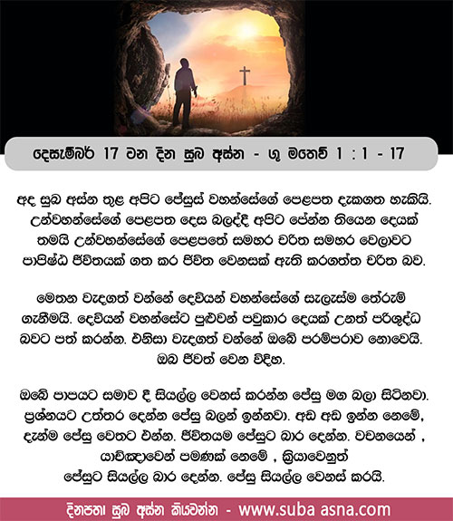 17 මෙසේ ආබ්රහම් පටන් දාවිත් දක්වා පරම්පරා සියල්ල දස සතරකි; දාවිත් පටන් බබිලෝනියේ විප්රවාසගතවීම දක්වා පරම්පරා දස සතරකි; බබිලෝනියේ විප්රවාසගතවීමේ කාලයේ පටන් ක්රිස්තුන් වහන්සේ දක්වා පරම්පරා දස සතරකි.