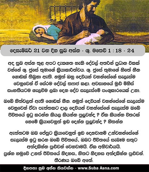 19 ඇගේ ස්වාමි පුරුෂයා වන ජෝසෙප්, සත් පුරුෂයෙකු වූ බැවින් ඇය ප්රසිද්ධියේ නින්දාවට නොපමුණුවන අදහසින්, රහසින් ඇය අත්හැරදමන්න සිතාගත්තේ ය. 20 එහෙත්, ඔහු මේ කාරණය ගැන කල්පනා කරමින් සිටිය දී, සමිඳාණන් වහන්සේගේ දූතයෙක් සිහිනයකින් ඔහුට දර්ශනය වී, ”දාවිත්ගේ පුත් ජෝසෙප්, ඔබේ බිරිඳ වන මරියා පාවාගන්නට බිය නොවන්න; මන්ද, ඈ ගැබ්ගෙන ඇත්තේ ශුද්ධාත්මයාණන් අනුහසින්. 21 ඈ පුතෙකු බිහි කරන්නී ය; උන් වහන්සේට ජේසුස් යන නාමය තැබිය යුතු ය; මන්ද, සිය සෙනඟ ඔවුන්ගේ පාපවලින් මුදාලන්නේ එතුමාණෝ ය”යි කී ය.