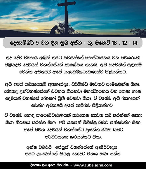 12 ”ඔබ කුමක් සිතන්නහු ද? බැටළුවන් සියයක් ඇති යම් මිනිසෙක්, උන්ගෙන් එකෙකු මුළා ව ගියොත්, ඉතිරි අනූ නවදෙනා කඳුකරයේ ඉන්න හැර, මුළා ව ගිය එකා සොයා යන්නේ නැද් ද? 13 සැබැවින් ම ඔබට කියමි, ඌ සම්බ වුනොත් මුළා ව නොගිය අනූනව දෙනා ගැන ප්රීති වෙනවාට වඩා ඌ ගැන ප්රීති වන්නේ ය. 14 එසේ ම මේ බාලයන් එක් කෙනෙකු වත් විනාශ වීම ස්වර්ගයෙහි වැඩ වසන ඔබගේ පියාණන් වහන්සේගේ කැමැත්ත නො වේ.”
