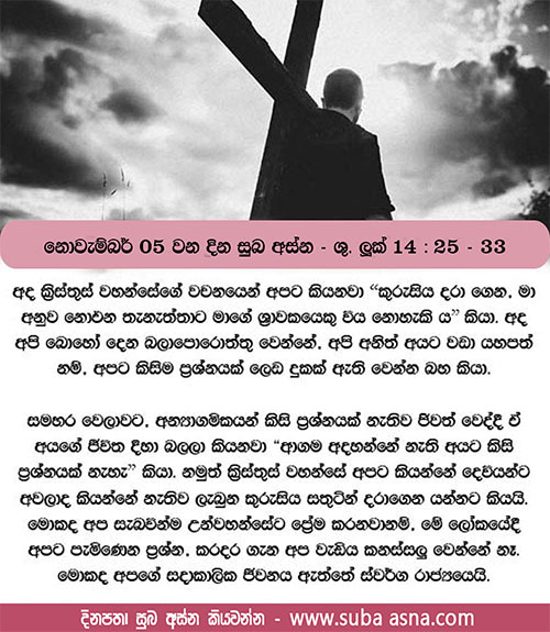 25 තවද මහා ජනකායක් ජේසුස් වහන්සේ සමඟ ගමන් ගත්හ. උන් වහන්සේ හැරී ඔවුන්ට මෙසේ වදාළ සේක: 26 ”මා වෙත එන තැනැත්තේ මට වඩා තම පියාට ද මවට ද භාර්යාවට ද දරුවන්ට ද සහෝදරයන්ට ද සහෝදරියන්ට ද තමාගේ ම ජීවිතයට වුව ද ප්රේම කරන්නේ නම්, ඔහුට මාගේ ශ්රාවකයෙකු විය නොහැකි ය. 27 කුරුසිය දරා ගෙන, මා අනුව නොඑන තැනැත්තාට මාගේ ශ්රාවකයෙකු විය නොහැකි ය. 28 ඔබ අතුරෙන් යමෙක් මුර අටල්ලක් ගොඩනැඟීමට අදහස් කරයි නම්, එය නිම කරලීමට කොතරම් වියහියදම් ඇද්දැ යි පළමුකොට හිඳ ගණන් නො බලන්නේ ද? 29 එසේ නොකළොත්, අත්තිවාරම දමා ඒ අටල්ල නිමකරන්නට නොහැකි වූ විට, එය දකින සියල්ලන්, 30 ‘මේ මිනිසා ගොඩනඟන්නට පටන්ගත් නමුත් නිම කරන්නට ඔහුට බැරි වී යයි කියා සරදම් කරනු ඇත. 31 තවද, තමන්ට විරුද්ධ ව විසි දහසක් රැගෙන යුද පිණිස එන රජෙකුට මුහුණ පෑමට දස දහසක් රැගෙන යා හැකි දැ යි පළමුකොට හිඳ නොවිමසන කිසි යම් රජෙක් ඇද් ද? 32 එසේ කළ නොහැකි නම්, ඔහු ඒ රජ දුර සිටිය දී ම, රාජ දූතයන් යවා, සාම ගිවිසුමක් ඉල්ලා සිටිනු ඇත. 33 එමෙන් ම ඔබ අතුරෙන් තමන් සතු සියල්ල අත් නොහරින කිසිවෙකුට මාගේ ශ්රාවකයෙකු වන්නට බැරි ය.”