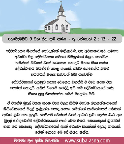 18 එකල ජුදෙව්වරු, ”ඔබ මේ දේවල් කරන බැවින් ලකුණක් පිණිස කුමන හාස්කමක් අපට දක්වන්නෙහි දැ”යි ඇසූ හ. 19 ජේසුස් වහන්සේ ඔවුන්ට පිළිතුරු දෙමින්, ”මේ දේව මාලිගාව කඩාදමන්න. තෙදිනකින් එය මම ගොඩනඟන්නෙමි”යි වදාළ සේක. 20 එවිට ජුදෙව්වරු කතා කොට, ”මේ දේව මාලිගාව ගොඩනඟන්නට හතළිස් හය වසක් ගත විය. ඔබ එය තෙදිනකින් ගොඩනඟන්නෙහි දැ”යි ඇසූ හ. 21 එහෙත්, උන් වහන්සේ කතා කෙළේ, තමන්ගේ ශරීරය නමැති දේව මාලිගාව ගැන ය. 22 උන් වහන්සේ මරණින් නැඟිටුවනු ලැබූ පසු, ශ්රාවකයෝ, උන් වහන්සේ මේ දේ කී බව සිහි කොට ශුද්ධ ලියවිල්ල ද උන් වහන්සේගේ වචනය ද විශ්වාස කළහ.