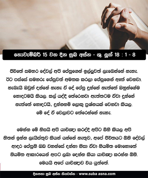 1 තවද ඔවුන් අධෛර්ය නොවී නොකඩවා යාච්ඤාවෙහි යෙදිය යුතු බව දක්වන පිණිස උන් වහන්සේ ඔවුන්ට මේ උපමාව වදාළ සේක: 2 ”එක් නුවරක දෙවියන්ට බිය නැති, මිනිසුන්ට ගරු නොකරන විනිශ්චයකාරයෙක් වී ය. 3 එම නුවර වැන්දඹුවක් ද වූවා ය; ඈ නොයෙක් වර ඔහු වෙත ගොස්, ‘මාගේ විරුද්ධකාරයා මට කළ අයුක්තියට, යුක්තිය ඉෂ්ට කළ මැනවැ’යි කීවා ය. 4 ඔහු කලක් ඒ ඉල්ලීම නොසලකා හැරියේ ය. පසුව ඔහු තමාට ම මෙසේ කියාගත්තේ ය, ‘මා දෙවියන් වහන්සේට ගරුබිය නොපෑවත්, මනුෂ්යයන්ට ගරු සරු නොකළත්, 5 මේ වැන්දඹුවගේ, කරදරය නිසා ඈ නිතර පැමිණ මා නොවෙහෙසන පිණිස, ඈට යුක්තිය ඉටු කර දෙමි’යි කීයේ ය.” 6 තවද, සමිඳාණන් වහන්සේ කතා කොට, ”මේ අධාර්මික විනිශ්චයකාරයා කියන දේ අසන්න. 7 දෙවියන් වහන්සේත්, දිවා රෑ දෙක්හි තමන් හට අයැදින, තමන් තෝරාගත් අය ගැන යුක්තිය ඉටු නොකරන සේක් ද? උන් වහන්සේ ඔවුන් ගැන බොහෝ නොඉවසන සේක් ද? 8 උන් වහන්සේ ඔවුන්ට වහා ම යුක්තිය ඉටු කරන සේකැ යි, මම ඔබට කියමි. එසේ වුව ද, මනුෂ්ය-පුත්රයාණන් වඩිනා කල මිහි පිට ඇදහිල්ල ඇති අය උන් වහන්සේට සම්බ වනු ඇද්දැ”යි ඇසූ සේක.