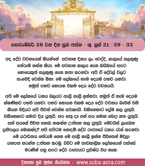 29 එබැවින් ඔබ කුමක් කන්නේ ද කියා වත්, කුමක් බොන්නේ ද කියා වත් සොයමින් කරදර නොවන්න. 30 මේ සියල්ල ලෝකයේ සියලු ජාතීහු මුළු සිතින් සොයා යති; මේ දේවල් ඔබට අවශ්ය බව ඔබේ පියාණන් වහන්සේ දන්නා සේක. 31 එසේ නොව උන් වහන්සේගේ රාජ්යය සොයා යන්න, එවිට මේ දේවල් ද ඔබට දෙනු ලැබේ.
