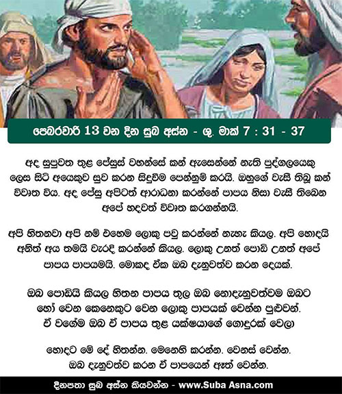 31 යළිත් උන් වහන්සේ තීර් පෙදෙසින් පිටත් ව, සීදොනය මැදින් ගොස්, දෙකපොලිස පෙදෙස පසු කොට ගලීල මුහුද ළඟට පැමිණි සේක. 32 එකල සෙනඟ වික්කල් බිහිරෙකු උන් වහන්සේ වෙත ගෙනවුත් ඔහු පිට අත තබන ලෙස උන් වහන්සේගෙන් උදක්ම ඉල්ලූ හ. 33 උන් වහන්සේ ඔහු සමූහයා කෙරෙන් වෙන් කොට ඉවතට ගෙන ගොස්, ඔහුගේ කන්වල උන් වහන්සේගේ ඇඟිලි බහා, කෙළ ගසා, ඔහුගේ දිව ස්පර්ශ කළ සේක. 34 ඉන්පසු ස්වර්ගය දෙස බලා, සුසුම් ලා, ”එප්පාතා”යි ඔහුට වදාළ සේක. එහි අර්ථය, ‘ඇරේවා’ යනු යි. 35 එවිට ඔහුගේ කන් ඇරී, දිවේ බැඳුම ලිහී, ඔහු පැහැදිලි ලෙස කතා කෙළේ ය. 36 ඒ බව කිසිවෙකුට නොකියන්න උන් වහන්සේ ඔවුන්ට අණ දුන් සේක. එහෙත්, උන් වහන්සේ එය යම් පමණ තහනම් කළ සේක් ද, ඔව්හු එපමණටත් වඩා එය පතළ කළහ. 37 එය ඇසුවෝ අතිශයින් මවිත ව, ”උන් වහන්සේ හැම දෙය ම යස ලෙස කරන සේක; බිහිරන්ට ඇසීම ද ගොළුවන්ට බිණීම ද පවා සලසා දෙන සේකැ”යි කී හ.