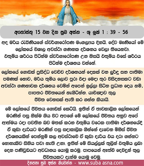 39 දින ගණනකට පසු මරිය තුමී නැඟිට ජුදා කඳුකරයෙහි නුවරකට යුහු ව ගොස්, 40 සෙකරියස්ගේ ගෙට ඇතුළු වී, එලිසබෙත් හට ආචාර කළා ය. 41 එලිසබෙත් මරිය තුමියගේ ආචාර බස් ඇසූ කල ඇගේ කුසෙහි දරුවා ඉපිලෙන්නට වන. එවිට එලිසබෙත් ශුද්ධාත්මයාණන්ගෙන් පූර්ණ ව, 42 මහ හඬින් උදන් අනමින්, ”ඔබ වනිතාවන් අතර අතිශයින් ආශීර්වාද ලද්දී ය. ඔබ කුස ඔත් දරු ඵලය ද ආශීර්වාද ලද්දේ ය. 43 මාගේ සමිඳාණන් වහන්සේගේ මෑණියන් මා වෙත පැමිණීමට තරම් මම කවරෙක් ද? 44 මක්නිසා ද ඔබේ ආචාර හඬ මා සවන් ගත වූ කෙණෙහි ම මා කුසෙහි දරුවා ප්රීතියෙන් ඉපිලී ගියේ ය. 45 සමිඳාණන් වහන්සේගේ නාමයෙන් තමන් හට දුන් පොරොන්දුව ඉටුවන්නේ ම යයි විශ්වාස කළ තැනැත්තී භාග්යවන්ත ය”යි කීවා ය.