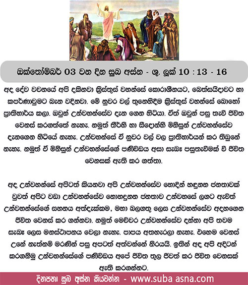 ඔක්තෝම්බර් 03 වන දින සුබ අස්න – ශු. ලූක් 10: 13 – 16