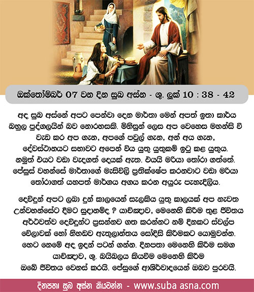 38 තවද ජේසුස් වහන්සේ සිය ශ්රාවකයන් සමඟ යද්දී, උන් වහන්සේ එක් ගමකට ඇතුළු වූ සේක. එවිට මාර්තා නම් එක් ස්ත්රියක් සිය නිවසට උන් වහන්සේ පිළිගත්තා ය. 39 ඇයට මරියා නම් සහෝදරියක් වූවා ය. ඈ සමිඳාණන් වහන්සේගේ පාමුල හිඳ උන් වහන්සේගේ ඉගැන්වීමට සවන් දුන්නා ය. 40 එහෙත් මාර්තා සත්කාර කටයුතු වැඩි වීමෙන් කරදර වී සිටියා ය. ඈ උන් වහන්සේ වෙතට පැමිණ, ”ස්වාමීනි, මාගේ සහෝදරිය පැත්තකට වී සත්කාර කටයුතු මා පිට ම පවරා සිටින හැටි ඔබ සලකන්නේ නැද් ද? එබැවින් මට උදව් කරන්නට ඈට කිව මැනවැ”යි කීවා ය. 41 එහෙත් සමිඳාණන් වහන්සේ උත්තර දෙමින්, ”මාර්තා, මාර්තා, ඔබ බොහෝ දේ ගැන කරදර වෙමින් නළංගු වන්නෙහි ය. 42 එහෙත් අවශ්ය එක දෙයකි. මරියා යහපත් දෙය තෝරාගෙන ඇත; එය ඈ කෙරෙන් පැහැරගනු නොලැබේ ය”යි වදාළ සේක.