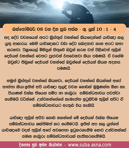 1 උන් වහන්සේ එක් තැනක යාච්ඤා කරමින් සිටි සේක. එය නිම වූ පසු උන් වහන්සේගේ ශ්රාවකයන්ගෙන් එක් තැනැත්තෙක් කතා කොට, ”ස්වාමීනි, ජොහන් තම ගෝලයන්ට ඉගැන්වූ ලෙස, අපටත් යාච්ඤා කරන්නට ඉගැන්නුව මැනවැ”යි කීවේ ය. 2 උන් වහන්සේ ඔවුන්ට මෙසේ වදාළ සේක: ”ඔබ යාච්ඤා කරන කල මෙසේ කියන්න: