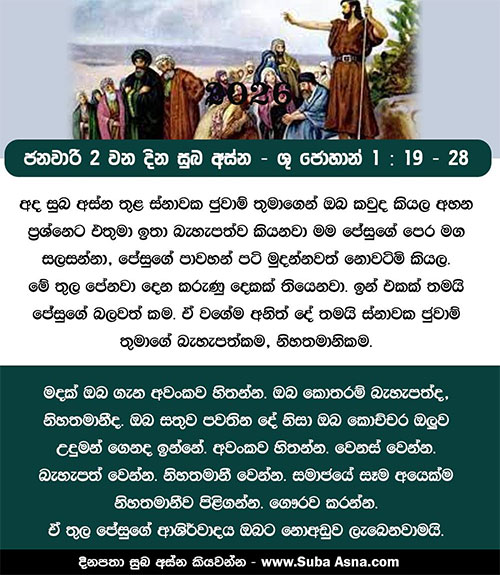 19 ”ඔබ කවරෙක් දැ”යි අසන පිණිස ජුදෙව්වරුන් විසින් ජෙරුසලමෙන් පූජකයන් ද ලෙවීයයන් ද යැවූ කල, ජොහන් සාක්ෂි දෙමින්, 20 ”මම ක්රිස්තුස් නොවෙමි”යි නොසඟවා ම ප්රකාශ කෙළේ ය. 21 ”එසේ නම් කිමෙක් ද? ඔබ එලියා දැ”යි ඔව්හු ඇසූ හ. ”නැතැ”යි ඔහු කී ය. ”ඔබ ඒ දිවැසිවරයා ද?” යන ප්රශ්නයටත්, ”නැතැ”යි ඔහු කී ය. 22 ”එසේ නම්, ඔබ කවරෙක් ද? අප එවූ අයට පිළිතුරක් දිය යුතු යි; ඔබ ගැන ම ඔබ කියන්නේ කිමෙක් දැ”යි ඔව්හු ඇසූ හ. 23 ”මම නම්, යෙසායා දිවැසිවරයා කී පරිදි, ‘සමිඳාණන්ගේ මඟ පිළියෙළ කරන්නැ’යි පාළුකරයෙහි මොරගසන්නෙකුගේ හඬ වෙමි”යි ජොහන් පිළිතුරු දුනි.