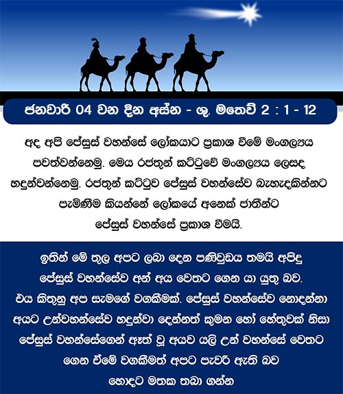 1 හෙරොද් රජු දවස ජුදයේ බෙත්ලෙහෙමෙහි ජේසුස් වහන්සේ උපන් කල, පෙරදිගින් ශාස්ත්රවන්තයෝ ජෙරුසලමට අවුත්, 2 ”ජුදෙව්වරුන්ට රජ ව උපන් උතුමාණෝ කොතැන්හි ද? අපි එතුමාණන්ගේ තාරකාව පෙරදිග දී දැක, එතුමාණන්ට නමස්කාර කරන පිණිස ආවෙමු”යි කී හ.