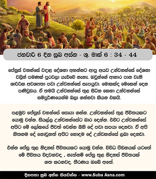 34 උන් වහන්සේ ගොඩට ආ කල, මහ පිරිසක් දැක, එඬේරෙකු නැති බැටළුවන් වැනි වූ, ඔවුන්ට අනුකම්පා කොට, ඔවුන්ට බොහෝ දේ උගන්වන්න පටන්ගත් සේක. 35 දවස ගෙවී යත් ම ශ්රාවකයෝ උන් වහන්සේ වෙත අවුත්, ”මෙය පාළු තැනකි; දැන් රෑ බෝ වී ඇත; 36 එබැවින් අවට ගම් නියම්ගම් වලට ගොස් තමන්ට කෑමට යමක් මිලයට ගන්න පිණිස මොවුන් යන්න හැරිය මැනවැ”යි කී හ. 37 එහෙත් උන් වහන්සේ උත්තර දෙමින්, ”ඔබ ම ඔවුන්ට කෑමට යමක් දෙන්නැ”යි වදාළ සේක. එවිට ඔව්හු පිළිතුරු දෙමින්, ”අප ගොස් රිදී කාසි දෙසියයක රොටි මිල දී ගෙන ඔවුන්ට කෑමට දෙන්න දැ”යි උන් වහන්සේගෙන් ඇසූ හ. 38 ”ඔබ ළඟ රොටි කීයක් තිබේ ද කියා ගොස් බලන්නැ”යි උන් වහන්සේ ඔවුන්ට වදාළ සේක. ඔව්හු සොයා බලා අවුත්, ”රොටි පහක් හා මසුන් දෙදෙනෙකැ”යි කී හ.