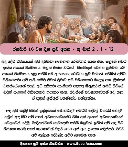 1 දින ගණනකට පසු ජේසුස් වහන්සේ යළිත් කපර්ණවුමට පිවිසුණු සේක. උන් වහන්සේ ගෙදර සිටින බව පතළ විය. 2 එවිට දොරකඩ අසලවත් ඉඩක් නැති තරමට මහ පිරිසක් එහි රැස් වූ හ. උන් වහන්සේ ඔවුන්ට දහම් දෙසමින් සිටි සේක. 3 එකල සතර දෙනෙක් අංසබාග රෝගියෙකු උසුලාගෙන උන් වහන්සේ වෙත ආහ. 4 සමූහය නිසා උන් වහන්සේ වෙත යාගත නොහැකි වූයෙන් ඔව්හු උන් වහන්සේ සිටි තැනට ඉහළින් පියස්සේ සෙවිල්ල හැර, පියස්ස කඩා, අංසබාග රෝගියා ඔත් යහන පහතට බැස්වූ හ. 5 ජේසුස් වහන්සේ ඔවුන්ගේ ඇදහිල්ල දැක, ”පුත්රය, ඔබේ පව් කමා කර තිබේ” යයි අංසබාග රෝගියාට වදාළ සේක. 6 එහෙත් එතැන හුන් විනයධරයන්ගෙන් සමහරෙක් තර්ක කරමින්, 7 ”මේ මිනිහා මෙසේ කතා කරන්නේ මක්නිසා ද? මේ දේවාපහාසයකි! දෙවියන් වහන්සේට මිස පව් කමා කරන්න පුළුවන් වෙන කාට දැ”යි සිතූ හ. 8 ඔවුන් මෙසේ තර්ක කරන බව ජේසුස් වහන්සේගේ සිතට එකෙණෙහි ම දැනී, ඔවුන්ට කතා කොට, ”ඔබ කුමක් නිසා ඔබේ සිත් තුළ මෙසේ තර්ක කරන්නහු ද? 9 වඩා පහසු කුමක් ද? අංසබාග රෝගියාට ‘ඔබේ පව් කමා කරන ලදැ’යි කීම ද? නැතහොත්, ‘නැඟිට ඔබේ යහන රැගෙන යන්නැ’යි කීම ද? 10 එහෙත්, මෙලොව දී පව් කමා කිරීමේ බලය මනුෂ්ය-පුත්රයාණන්ට ඇති බැව් ඔබ දැනගන්නා පිණිස මම මෙසේ කරමි”යි කියා උන් වහන්සේ අංසබාග රෝගියාට කතා කොට, 11 ”නැඟිට ඔබේ යහන රැගෙන ගෙදර යන්නැ යි මම ඔබට කියමි”යි වදාළ සේක. 12 ඔහු නැඟිට එකෙණෙහි ම යහන රැගෙන පිරිස බලා සිටිය දී ම නික්ම ගියේ ය. සියල්ලෝ ම විස්මිත ව, ”මෙවැන්නක් අප කවදාවත් දැක නැතැ”යි කියමින් දෙවියන් වහන්සේට ප්රශංසා කළහ.