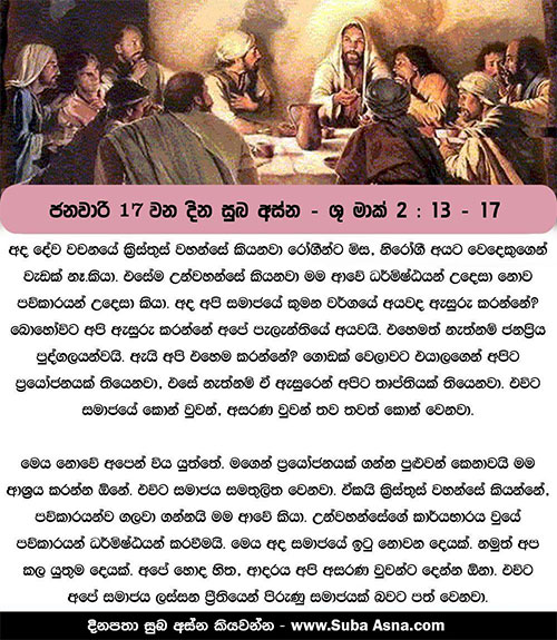 15 තවද, උන් වහන්සේ ඔහුගේ නිවෙසහි කෑමට වැඩහුන් කල අයකැමියන් සහ පව්කාරයන් බොහෝ දෙනෙක් ද උන් වහන්සේ සහ උන් වහන්සේගේ ශ්රාවකයන් සමඟ හිඳගත්හ. ඔවුන්ගෙන් බොහෝ දෙනෙක් උන් වහන්සේගේ අනුගාමිකයෝ වූ හ. 16 උන් වහන්සේ පව්කාරයන් හා අයකැමියන් සමඟ ආහාර වළඳනු දුටු පරිසිවරුන්ගේ පක්ෂයේ විනයධරයෝ, ”බලන්න, උන් වහන්සේ අයකැමියන් හා පව්කාරයන් සමඟ කන බොන සැටි”යි ශ්රාවකයන්ට කී හ. 17 ජේසුස් වහන්සේ ඒ අසා, ”රෝගීන්ට මිස නිරෝගීන්ට වෙදෙකුගෙන් වැඩක් නැත; මා ආයේ දමිටුන් නොව අදමිටුන් කැඳවීමට ය”යි වදාළ සේක.