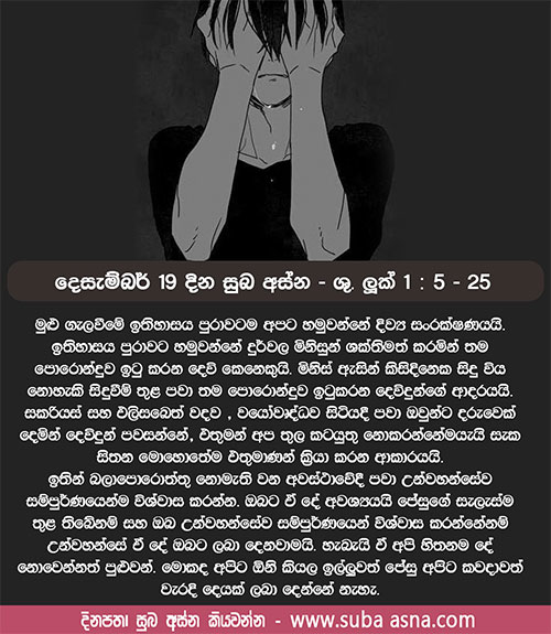 18 එවිට සෙකරියස්, දේව දූතයා අමතමින්, ”මා මෙය දැනගන්නේ කෙසේ ද? මම මහල්ලෙක්මි; මාගේ භාර්යාව ද වයස්ගත ව සිටී ය”යි කී ය. 19 දේව දූතයා පිළිතුරු දෙමින්, ”දෙවියන් වහන්සේ අබිමුවෙහි සේවා කරන ගාබ්රියෙල් මම ය; මා එවන ලද්දේ ඔබ සමඟ කතා කරන්නටත්, මේ සුබ ආරංචිය ඔබට පවසන්නටත් ය. 20 බලන්න. නියම කාලයෙහි ඉටුවන්න යන, මා කී දේ ඔබ අවිශ්වාස කළ බැවින්, මේ කාරණා සිදු වන දවස දක්වා ඔබ කතා කළ නොහැකි ව නිහඬ වනු ඇතැ”යි කී ය.