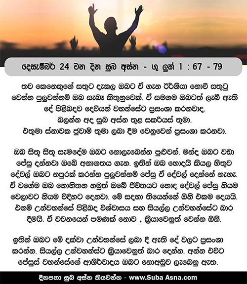 79 අපේ පාද සමාදාන මාර්ගයට පමුණුවන පිණිසත්, ඉහළින් අරුණාලෝකය අප කරා පහළවන්නේයයි කීයේය.