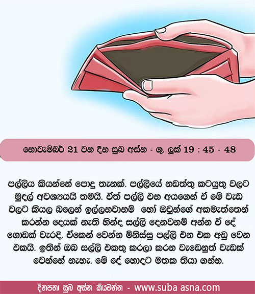 45 උන් වහන්සේ දේව මාලිගාවට ඇතුළු වී, එහි සිටි වෙළඳුන් පලවා හරින්න පටන්ගෙන, 46 ” ‘මාගේ ගෘහය යාච්ඤාවේ ගෘහයක් වන්නේ ය’යි ලියා ඇත. එහෙත් ඔබ එය සොරුන්ගේ ගුහාවක් කර තිබේ ය”යි ඔවුන්ට වදාළ සේක.