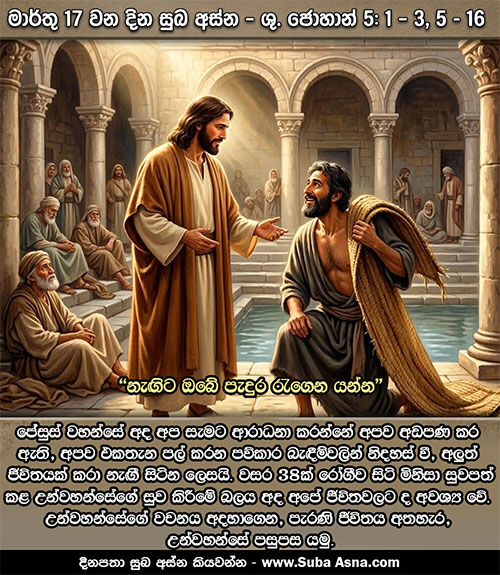 1 ඉන්පසු ජුදෙව්වරුන්ගේ මංගල්යයක් විය. ජේසුස් වහන්සේ ද ජෙරුසලමට වැඩම කළ සේක. 2 ජෙරුසලමෙහි බැටළු දොරටුව ළඟ, හෙබ්රෙව් බසින් ‘බෙතෙස්දා’ යයි නම් ලත් පොකුණක් විය. එය අවට ද්වාර මණ්ඩප පහක් විය. 3 ඒවායෙහි අන්ධ වූ ද කොර වූ ද අංශභාග වූ ද රෝගීන් සමූහයක් ඔත්පළ ව සිටියෝ ය. 5 එහි තිස් අට අවුරුද්දක් රෝගී ව සිටි එක් මිනිසෙක් විය. 6 ඒ මිනිසා හාන්සි වී සිටිනු ජේසුස් වහන්සේ දැක, ඔහු බොහෝ කලක් එහි සිටි බව දැන, ”ඔබ සුව වීමට කැමැති දැ”යි ඔහුගෙන් ඇසූ සේක. 7 රෝගියා උන් වහන්සේට උත්තර දෙමින්, ”ස්වාමීනි, වතුර කැළඹෙන විට මා පොකුණට බස්වන්නට කිසිවෙක් නැත. මා එන අතර, අන් කෙනෙක් මට පළමුවෙන් බසින්නේ ය”යි කීවේ ය. 8 ”නැඟිට ඔබේ පැදුර රැගෙන යන්නැ”යි ජේසුස් වහන්සේ ඔහුට වදාළ සේක. 9 එකෙණෙහි ම මිනිසා සුවපත් වී, සිය පැදුර රැගෙන යන්නට ගියේ ය.